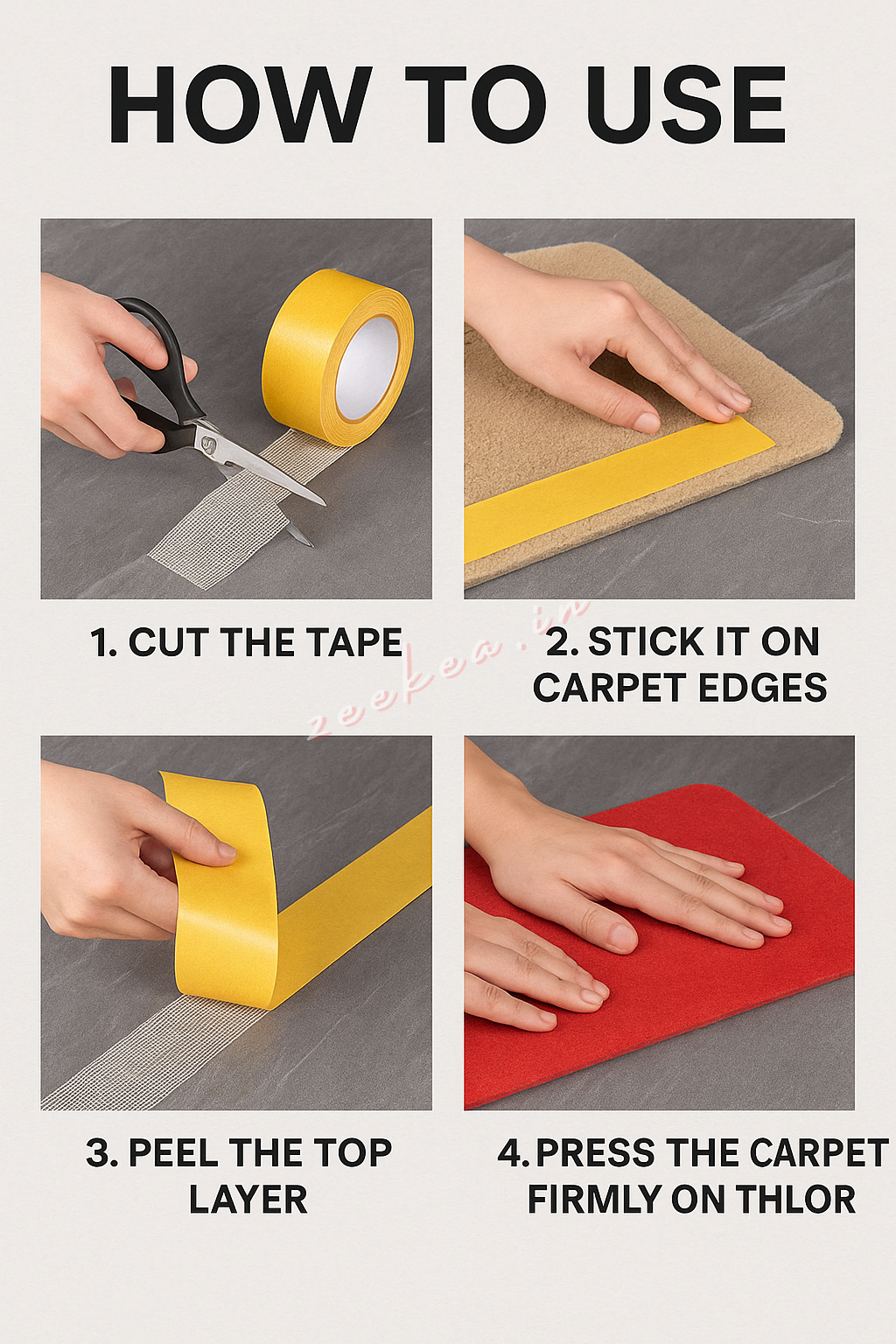 Stick the tape to the carpet or item, then press it down firmly onto the surface. Done in seconds—no mess, no tools!